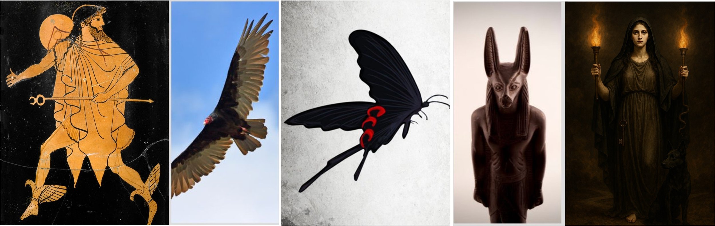 Psychopomps across the world - (left to right) Hermes (Greek), Turkey Vultures (Asia and the Americas), Death Butterflies (Mexican), Set (Egyptian), Hecate (Greek)